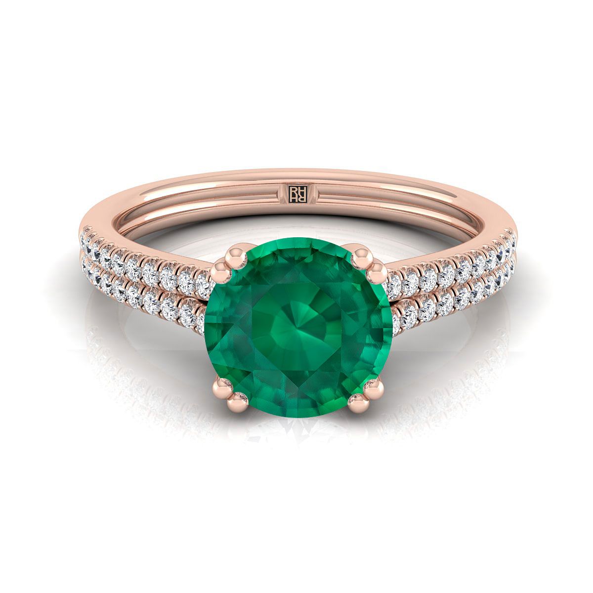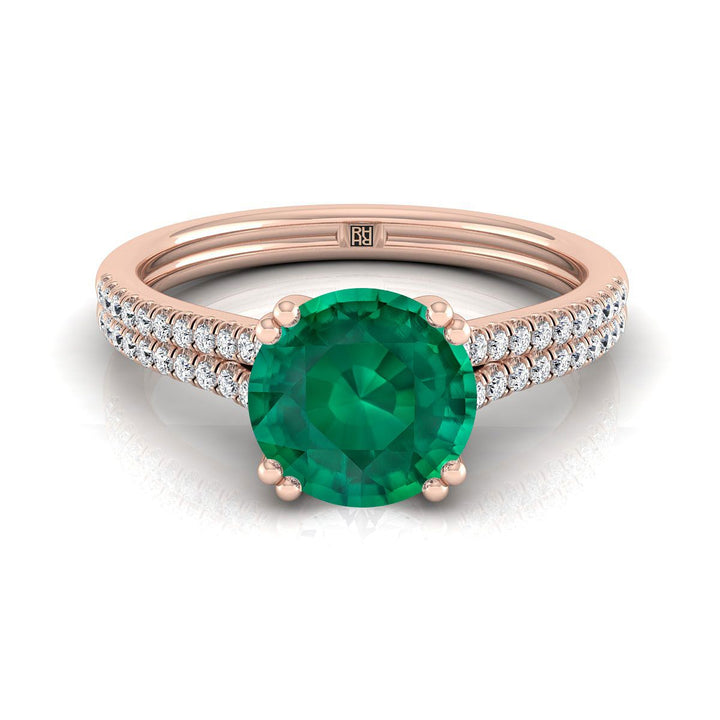 แหวนหมั้นเพชรฝรั่งเศสแบบฝังเพชรสองแถวสองกรงเล็บทรงกลมเจียระไนแบบบริลเลียนต์มรกตทองกุหลาบ 14K - 1/6ctw