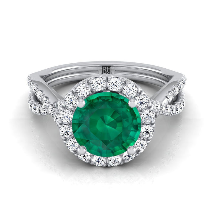 แหวนหมั้นเพชรทรงกลมเจียระไนแบบบริลเลียนท์แพลทินัม ประดับเพชรเอเมอรัลด์บิดลายขอบหยักแบบปาเว่ฮาโล - 1/2ctw