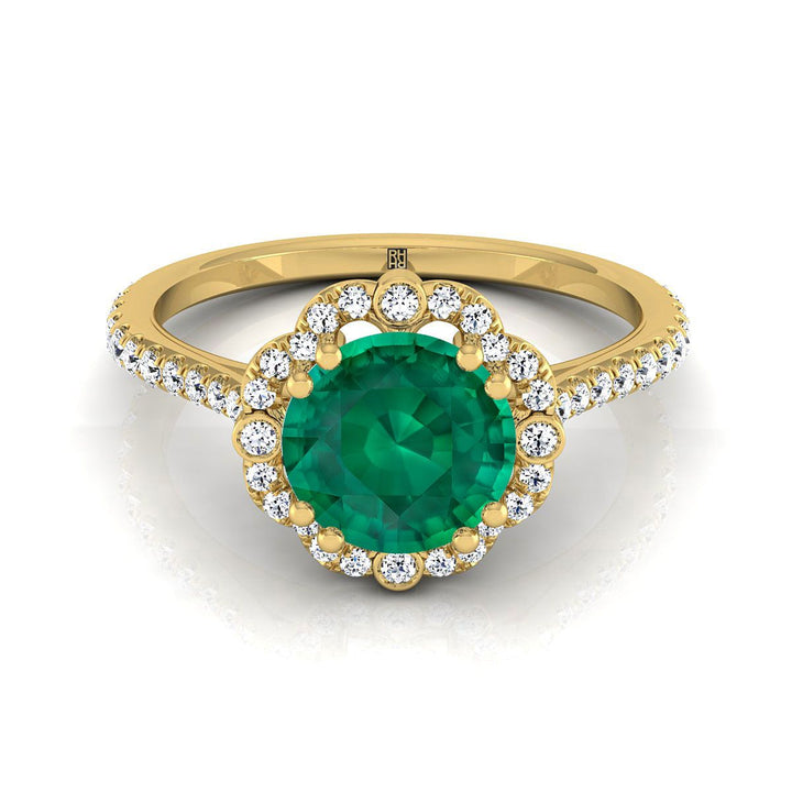 แหวนหมั้นทองคำเหลือง 14k พร้อมเพชรทรงกลมมรกตขนาด 6 มม. ตรงกลาง และเพชรเจียระไนแบบ Brilliant รอบๆ จำนวน 12 เม็ด น้ำหนักรวม 0.10 กะรัต