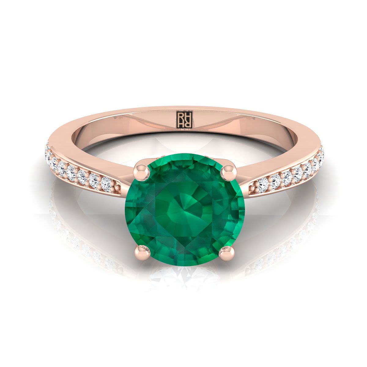 แหวนหมั้นเพชรทรงกลมเจียระไนแบบบริลเลียนท์สีมรกตแบบเรียวประดับเพชรปาเว่ทองกุหลาบ 14K - 1/8ctw