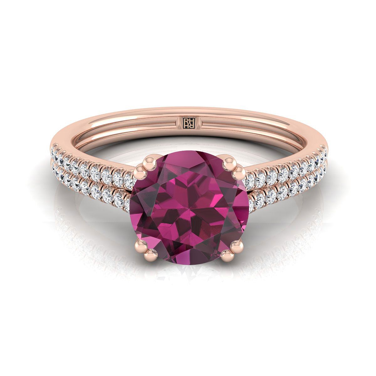 แหวนหมั้นเพชรฝรั่งเศสแบบฝังเพชรสองแถวสองกรงเล็บทรงกลมเจียระไนแบบบริลเลียนต์สีโรสโกลด์ 14K ประดับการ์เนต