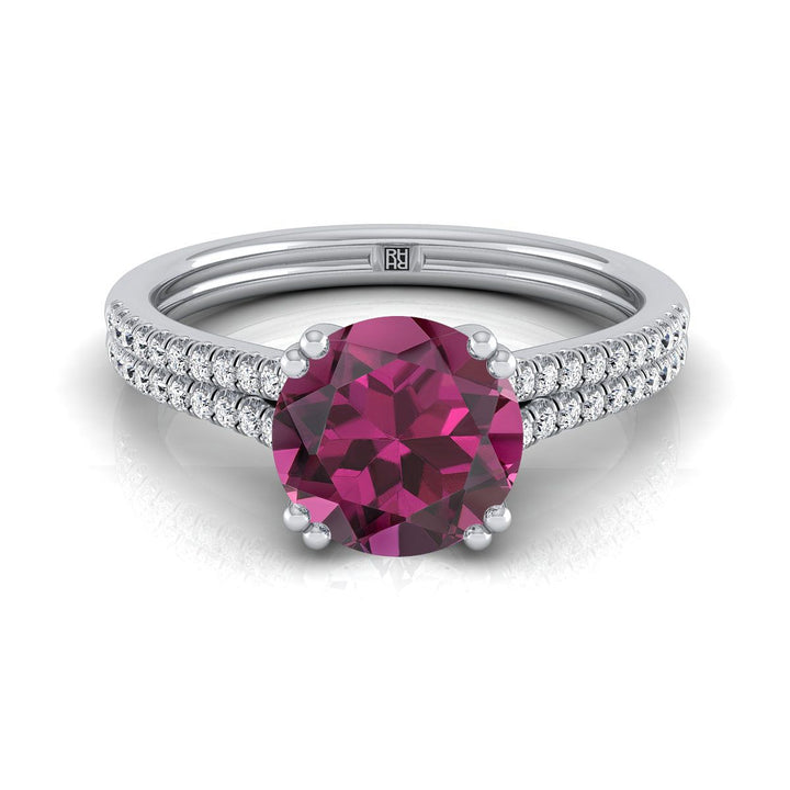 แหวนหมั้นเพชรฝรั่งเศสแบบฝังเพชรสองแถวสองกรงเล็บทรงกลมเจียระไนแบบเจิดจรัสด้วยโกเมนทองคำขาว 14K - 1/6ctw