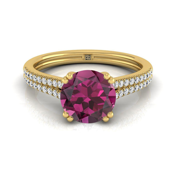แหวนหมั้นเพชรฝรั่งเศสแบบฝังเพชรสองแถวสองกรงเล็บทรงกลมเจียระไนแบบบริลเลียนต์จากทองคำเหลือง 14K ประดับการ์เนต
