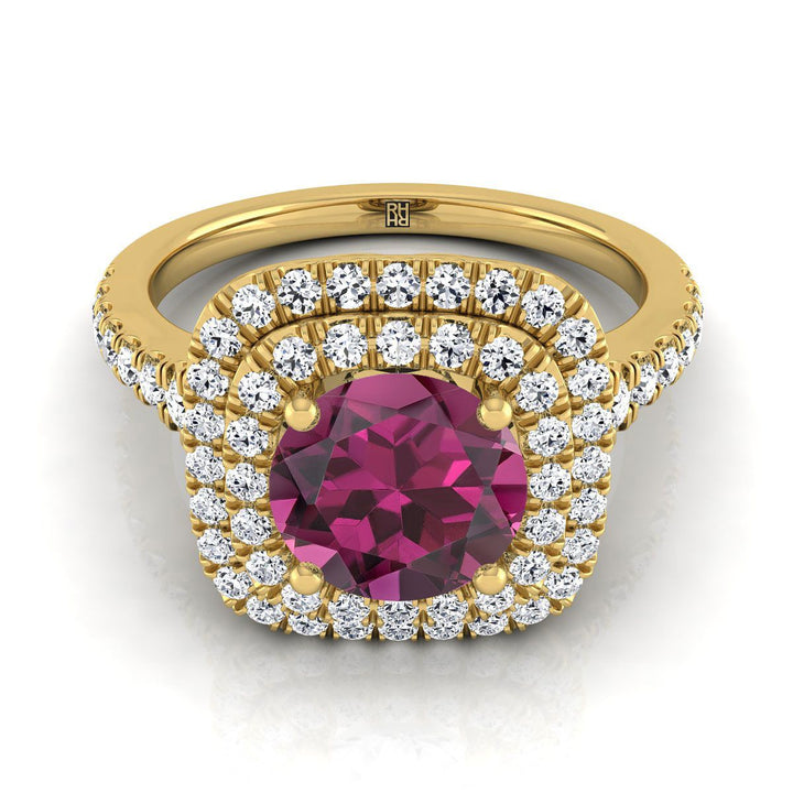 แหวนหมั้นทองคำเหลือง 14K ประดับการ์เนตทรงกลมเจียระไนแบบ Brilliant พร้อมวงแหวนคู่แบบ Halo และเพชร Pavé ขอบหยัก - 1/2ctw