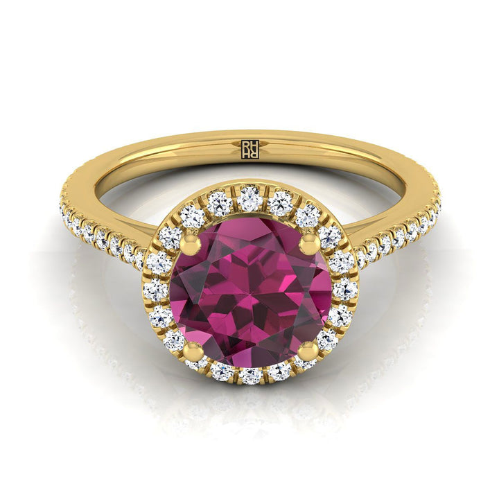 แหวนหมั้นทองคำเหลือง 18K ทรงกลมเจียระไนแบบคลาสสิก ฝรั่งเศสแบบปาเว่และฮาโลว์เชิงเส้น - 1/4ctw
