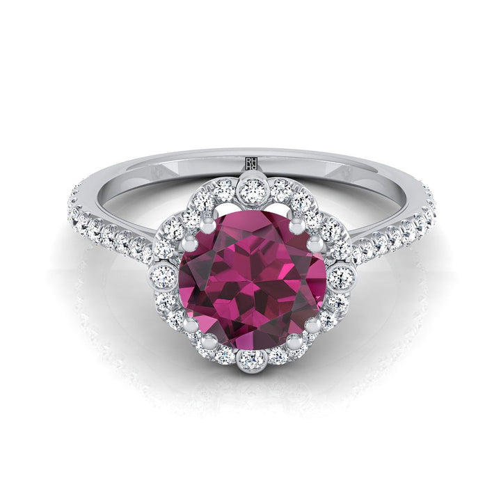 แหวนหมั้นแพลทินัมพร้อมพลอยแกร์เนตทรงกลมขนาด 6 มม. ตรงกลาง และเพชรทรงกลมเจียระไนแบบ Brilliant จำนวน 12 เม็ด น้ำหนักรวม 0.10 กะรัต