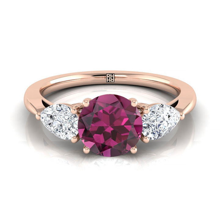 แหวนหมั้นเพชรสามเม็ดรูปทรงลูกแพร์ที่เข้าคู่กันอย่างสมบูรณ์แบบ ประกอบด้วยการ์เนตทรงกลมเจียระไนแบบ Brilliant สีโรสโกลด์ 14K - 7/8ctw