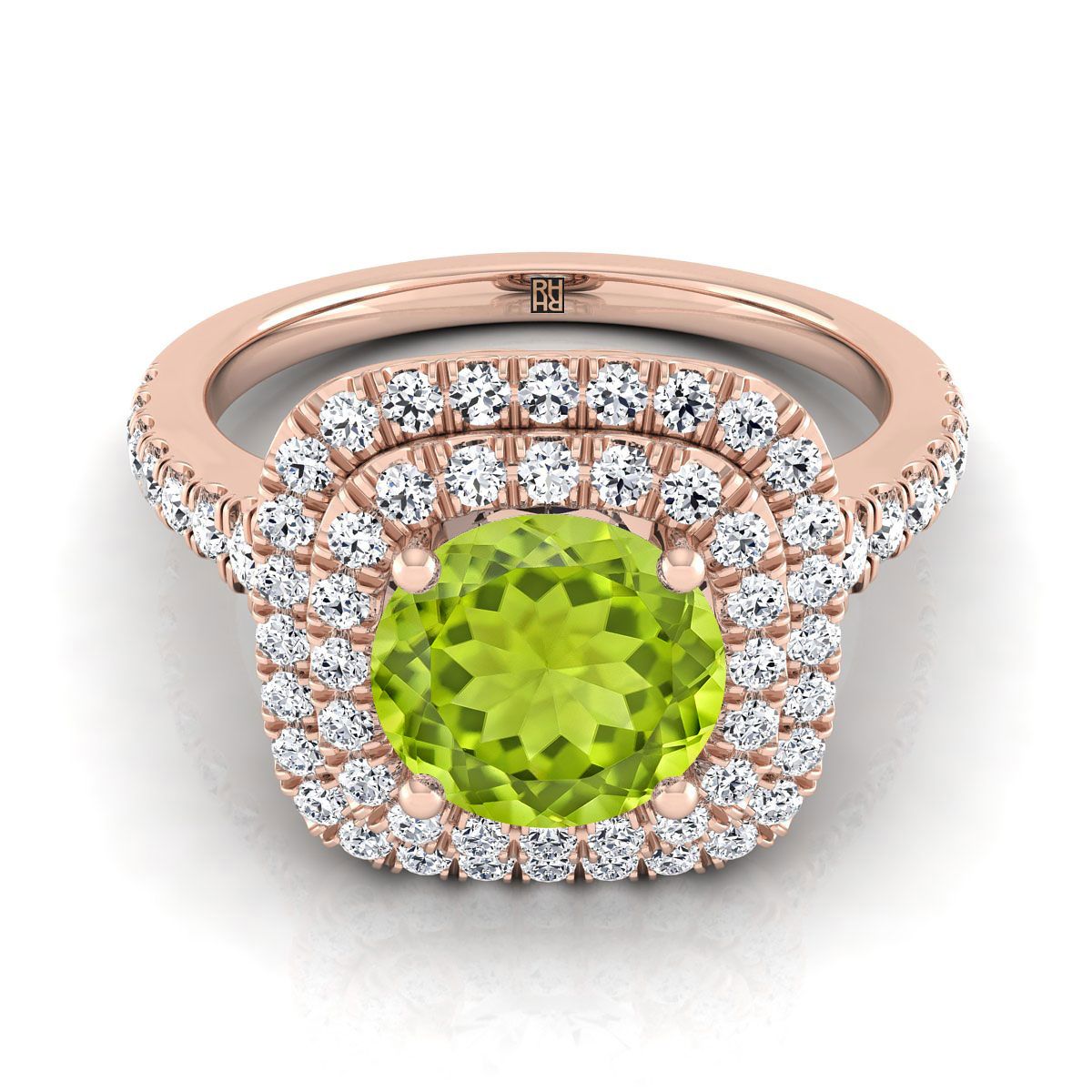 แหวนหมั้นเพชรแบบดับเบิลฮาโลว์ทรงกลมเพชรเจียระไนแบบบริลเลียนท์สีโรสโกลด์ 14K ประดับเพอริดอตและเพชรแบบสกัลลอปด์ pavé - 1/2ctw