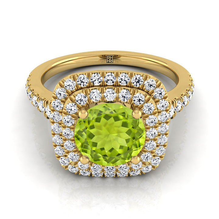 แหวนหมั้นเพชรแบบดับเบิลฮาโล่ทรงกลมประดับเพอริดอตเจียระไนแบบบริลเลียนต์สีเหลืองทอง 14K พร้อมเพชรปาเว่ขอบหยัก - 1/2ctw