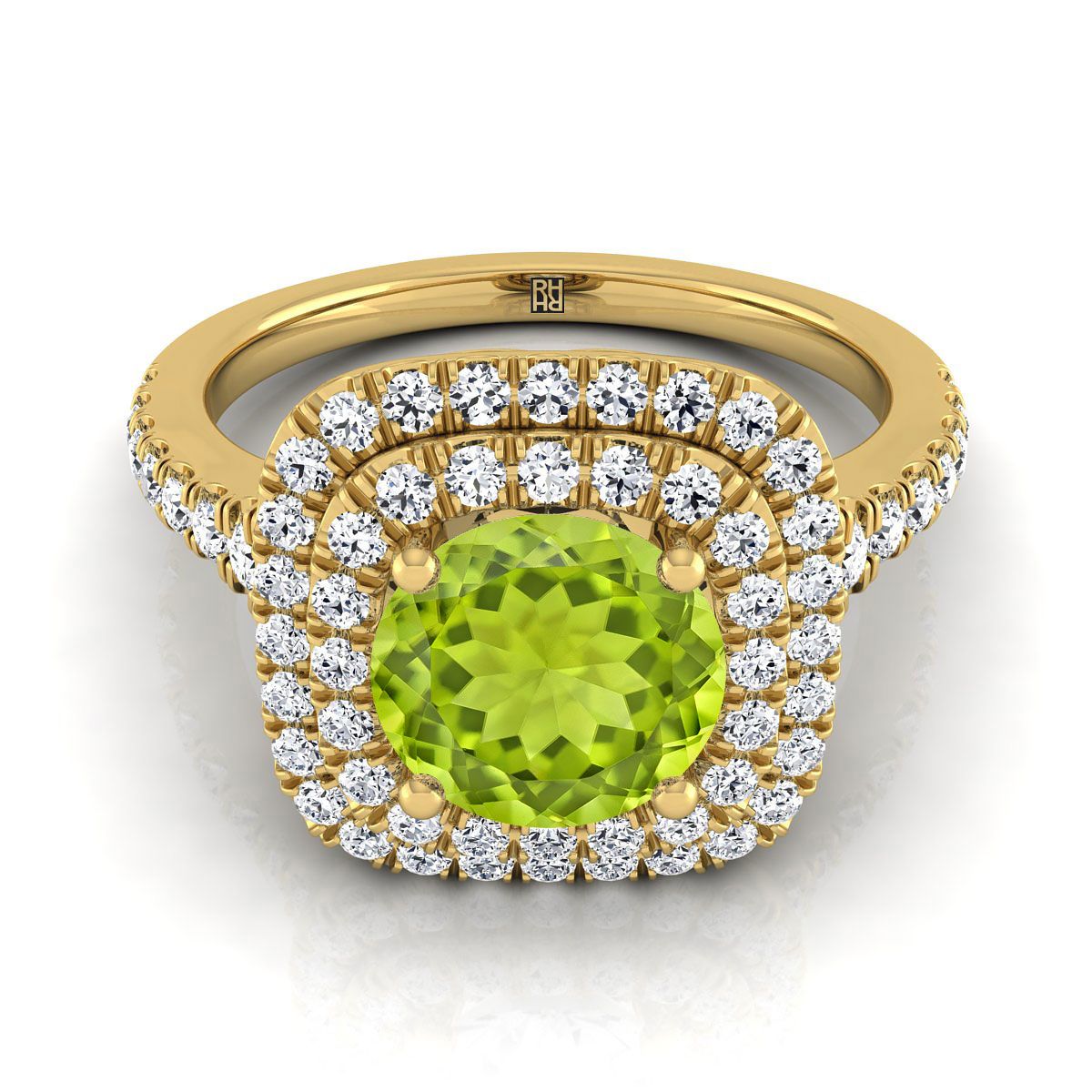 แหวนหมั้นเพชรแบบดับเบิลฮาโลว์ทรงกลมเจียระไนแบบบริลเลียนต์สีเหลืองทอง 18K ประดับเพอริดอตและเพชรแบบสกัลลอปด์ปาเว่ - 1/2ctw