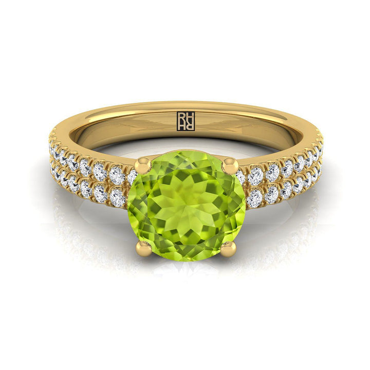 แหวนหมั้นแถวเพชรแบบดับเบิลเพฟรูปทรงกลมเจียระไนแบบบริลเลียนต์สีเหลืองทอง 14K ประดับเพอริดอต - 1/4ctw