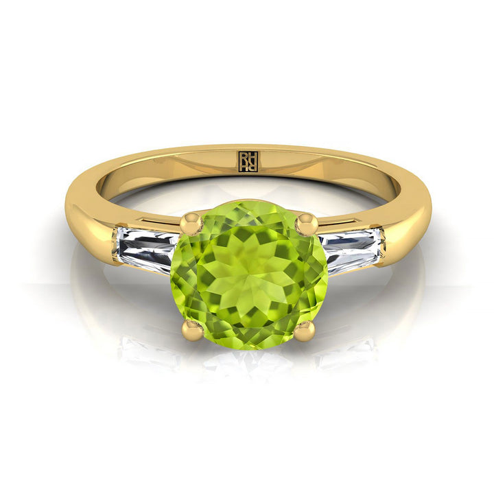แหวนหมั้นเพอริดอตทรงกลมเจียระไนแบบบริลเลียนต์สามเม็ด ประกอบด้วยทองคำเหลือง 14K และบาแกตต์ทรงเรียว - 1/5 กะรัตรวม