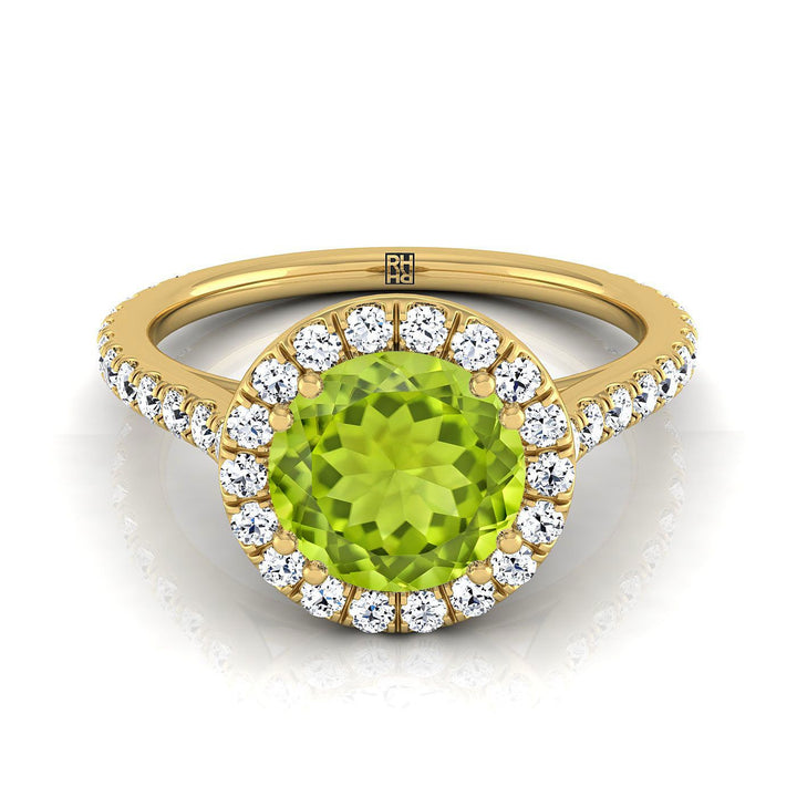 แหวนหมั้นเพชรฮาโลแบบแฟนซีแนวนอนทรงกลมเจียระไนแบบบริลเลียนต์สีเหลืองทอง 14K ประดับเพอริดอต 1/2ctw