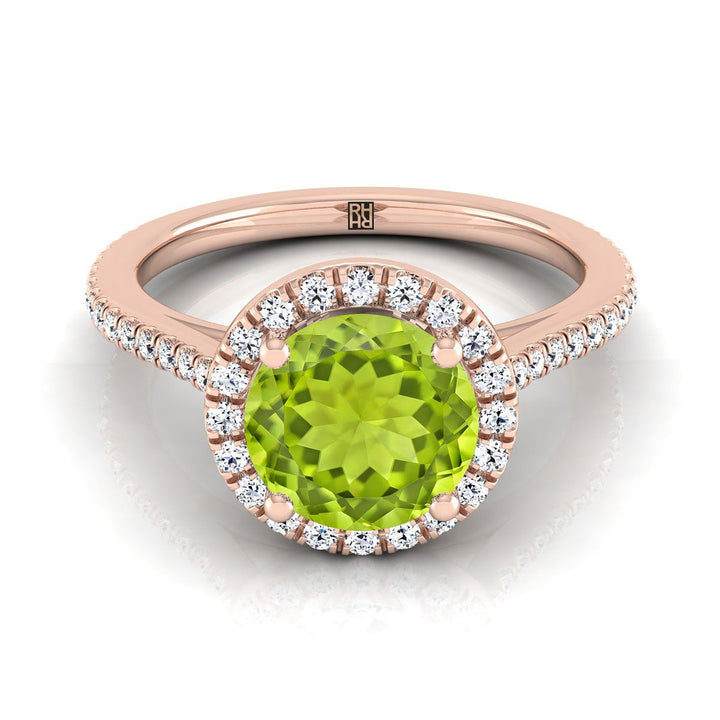 แหวนหมั้นทองคำชมพู 14k พร้อมเพชรประดับรอบ 50 เม็ด น้ำหนักรวม 0.25 กะรัต และพลอยเพอริดอตทรงกลมขนาด 6 มม. ตรงกลาง