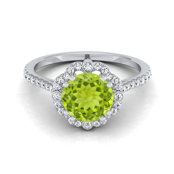 แหวนหมั้นดีไซน์วินเทจประดับเพอริดอตทรงกลมเจียระไนแบบบริลเลียนท์แพลทินัม พร้อมฮาโลเพชรประดับ - 1/4ctw