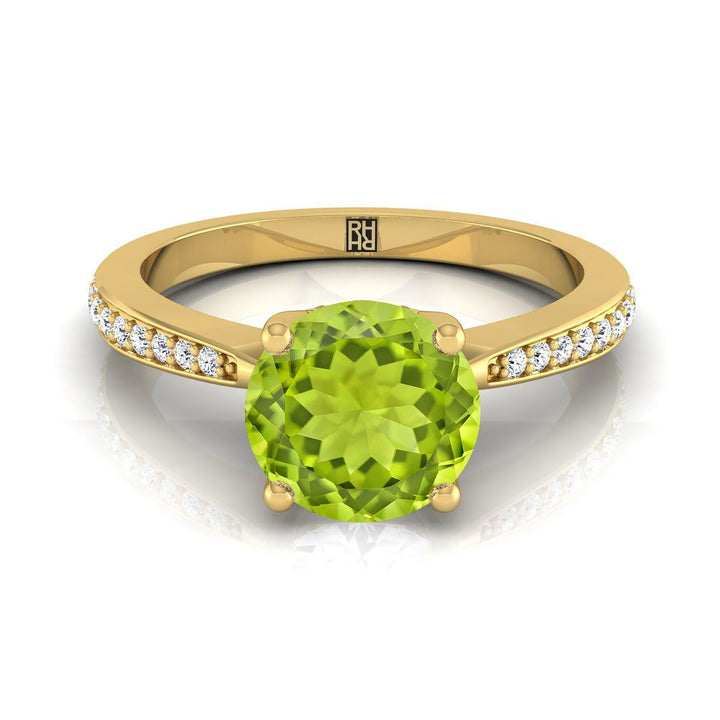 แหวนหมั้นเพชรแบบปูด้วยเพชรทรงกลมเจียระไนแบบบริลเลียนต์สีเขียวเพอริดอตทรงเรียวทองคำเหลือง 14K - 1/8ctw