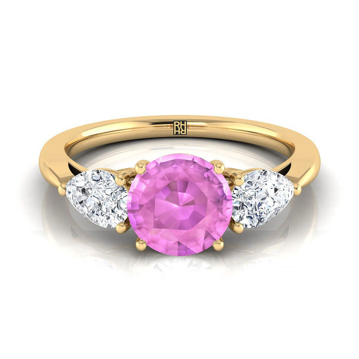 แหวนหมั้นทองคำ 14 กะรัต สีเหลือง พร้อมพลอยไพลินสีชมพูทรงกลมขนาด 6 มม. ตรงกลาง และเพชรรูปทรงลูกแพร์ 2 เม็ด น้ำหนักรวม 1.00 กะรัต