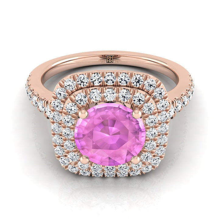 แหวนหมั้นทองคำชมพู 14K รูปทรงกลมประดับแซฟไฟร์สีชมพูแบบดับเบิลฮาโล่พร้อมเพชรปาเว่ขอบหยัก - 1/2ctw