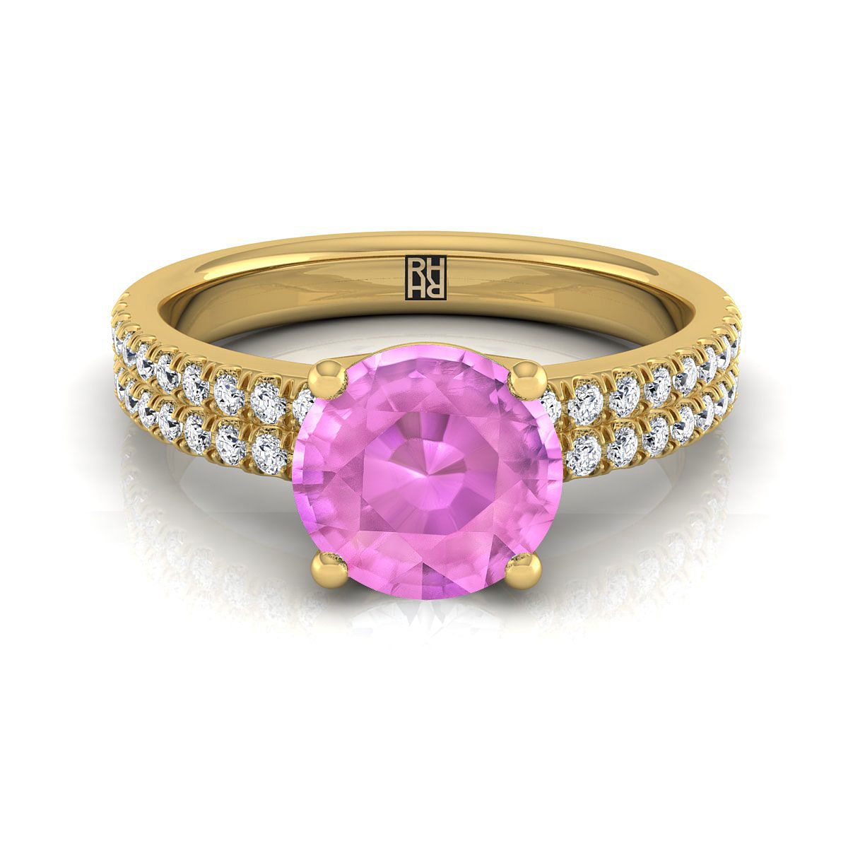 แหวนหมั้นแถวเพชรคู่ประดับแซฟไฟร์สีชมพูทรงกลมเจียระไนแบบ Brilliant ทองคำเหลือง 18K - 1/4ctw