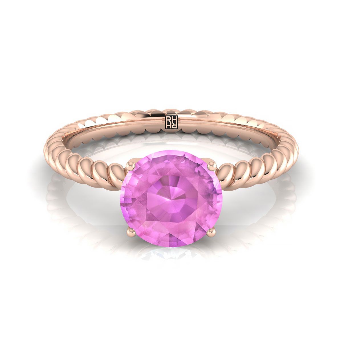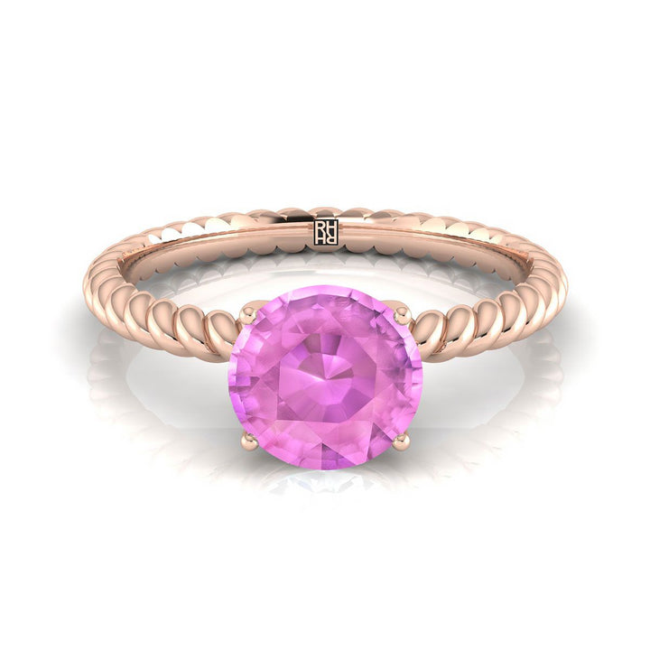 แหวนหมั้นทองคำชมพู 14k พร้อมพลอยไพลินสีชมพูทรงกลมขนาด 6 มม. ที่ศูนย์กลาง และดีไซน์เชือกที่ก้านแหวน