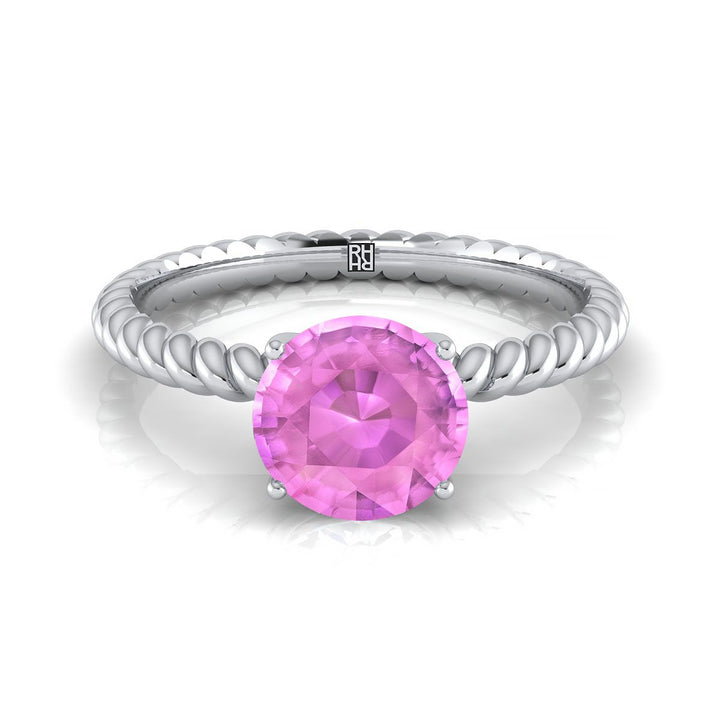 แหวนหมั้นทองคำขาว 14 กะรัต พร้อมพลอยไพลินสีชมพูทรงกลมขนาด 6 มม. ที่ศูนย์กลาง และดีไซน์สายเชือกที่วงแหวน