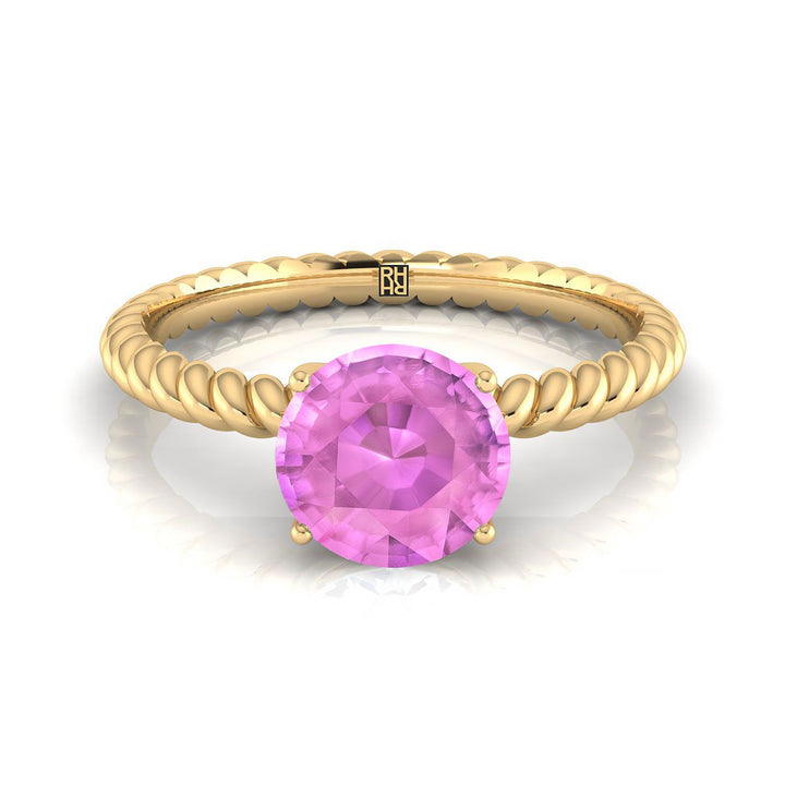 แหวนหมั้นทองคำ 18 กะรัต สีเหลือง พร้อมพลอยไพลินสีชมพูทรงกลมขนาด 6 มม. ที่ศูนย์กลาง และดีไซน์เชือกที่วงแหวน