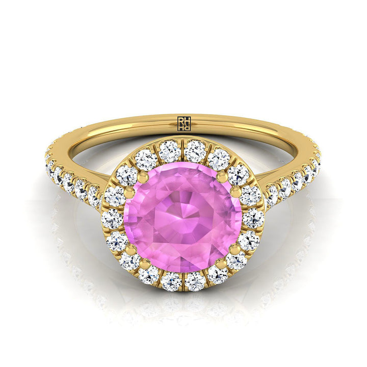 แหวนหมั้นเพชรฮาโลว์ทรงกลมแบบแฟนซีแนวนอนสีชมพูแซฟไฟร์ทรงกลมเจียระไนแบบบริลเลียนต์ทองคำเหลือง 18K - 1/2ctw