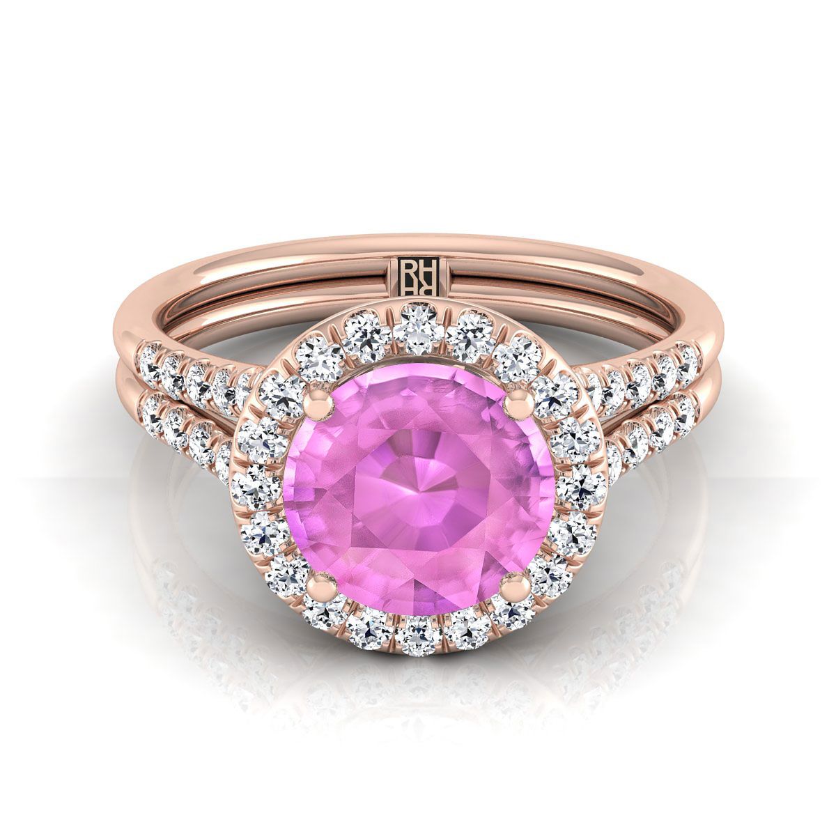 แหวนหมั้นทองคำชมพู 14K ทรงกลมเจียระไนแบบบริลเลียนต์ ฝรั่งเศสประดับเพชรแบบปาเว่ แยกช้างแหวนแบบฮาโล - 3/8ctw