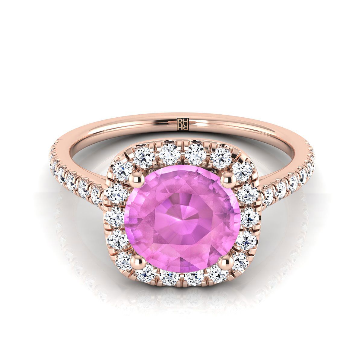 แหวนหมั้นประดับไพลินสีชมพูทรงกลมเจียระไนแบบ Brilliant แบบ Halo ประดับเพชรแบบ Pave ทองกุหลาบ 14K - 1/3ctw