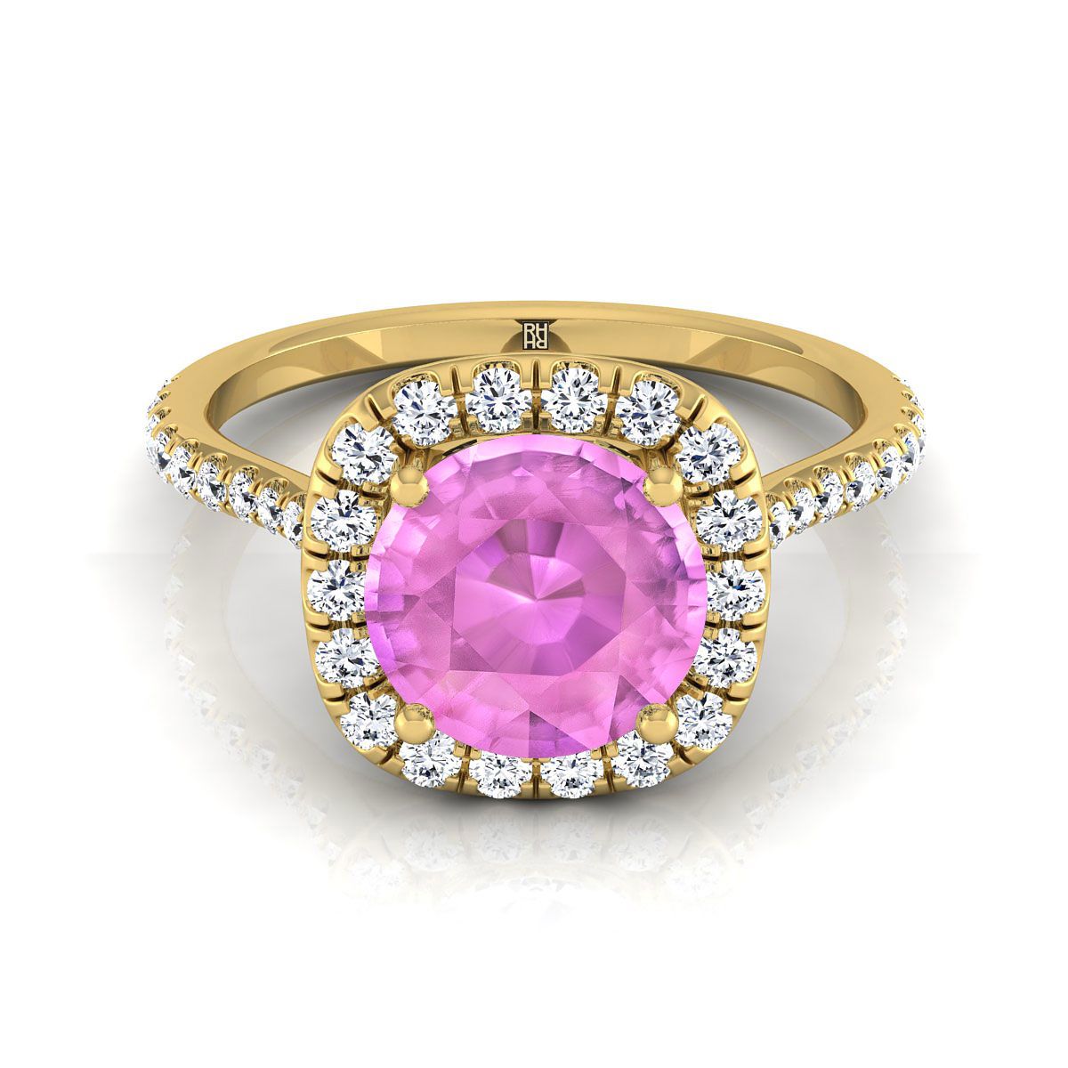 แหวนหมั้นทองคำเหลือง 18K ประดับไพลินสีชมพูทรงกลมเจียระไนแบบ Brilliant พร้อมเพชรล้อมแบบ Shared Prong น้ำหนักรวม 3/8 กะรัต