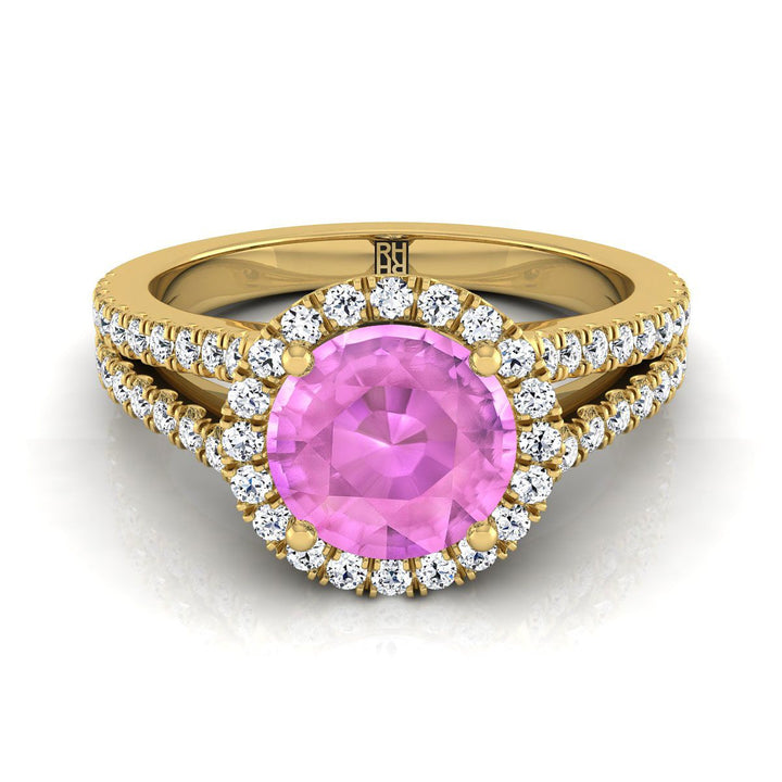 แหวนหมั้นทองคำเหลือง 18K ประดับไพลินสีชมพูทรงกลมเจียระไนแบบ Brilliant พร้อมฮาโลรอบเม็ดกลางและชิ้นแยกแบบฝรั่งเศสประดับเพชร - 3/8ctw