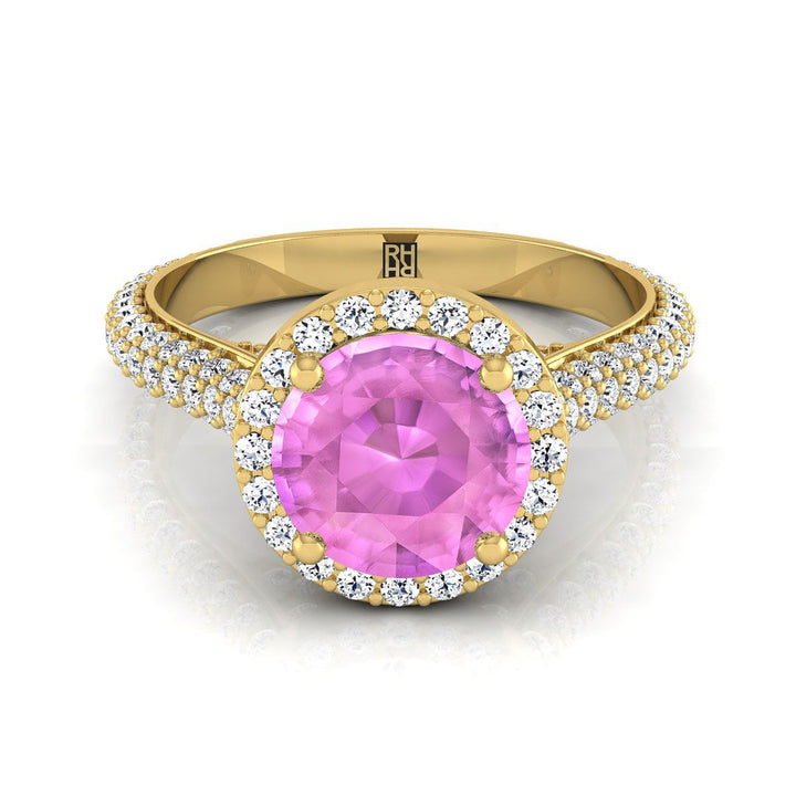 แหวนหมั้นทองคำเหลือง 18K ประดับไพลินสีชมพูทรงกลมเจียระไนแบบ Brilliant พร้อมไมโครปาเว่และฮาโล่ พร้อมเพชรข้างแบบปาเว่ - 7/8ctw