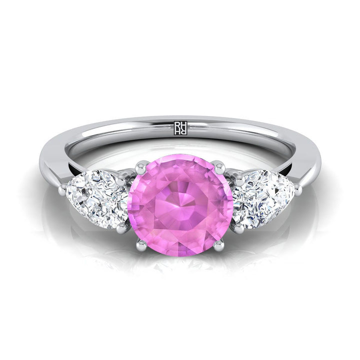แหวนหมั้นเพชรสามเม็ดรูปทรงลูกแพร์ที่เข้าคู่กันอย่างสมบูรณ์แบบ ประกอบด้วยแซฟไฟร์สีชมพูทรงกลมเจียระไนแบบ Brilliant Platinum น้ำหนักรวม 7/8 กะรัต