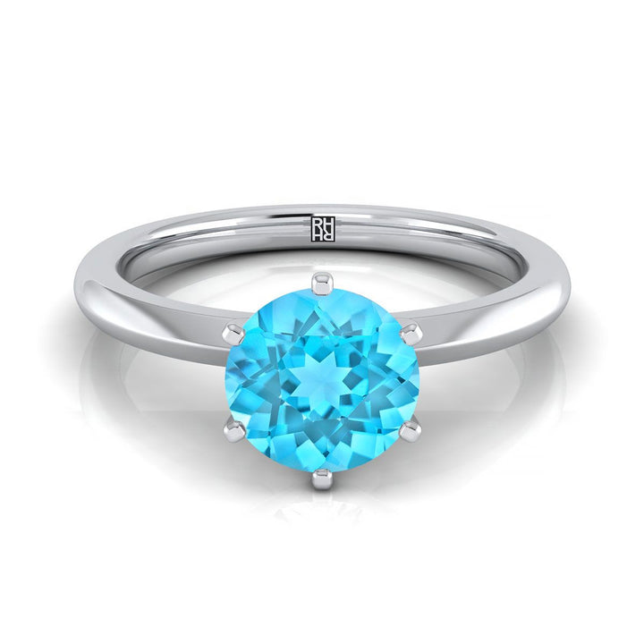 แหวนหมั้นเดี่ยวทองคำขาว 14K ทรงกลมเจียระไนแบบ Brilliant สีฟ้าสวิสโทแพซ พร้อมดีไซน์หนีบและขอบจับแบบก้ามปูที่สวมใส่สบาย