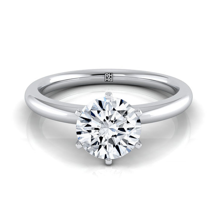 แหวนหมั้นเดี่ยวเจียระไนสวยงามนี้เป็นการแสดงออกถึงสไตล์คลาสสิก โชว์แหวนวงโค้งมนและการตั้งเม็ดกลางแบบ 6 ก้านในทองคำขาว 14 กะรัต