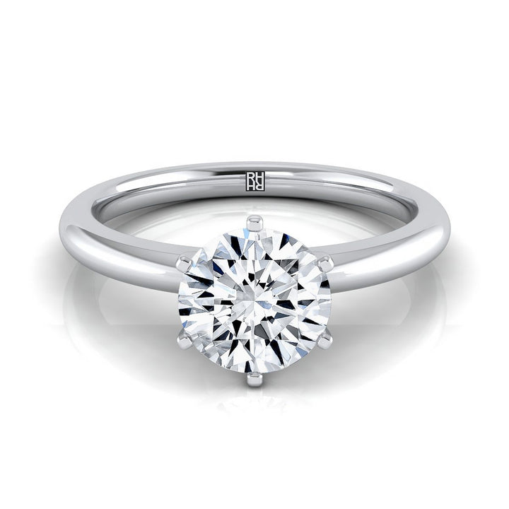 แหวนหมั้นเดี่ยวเจียระไนสวยงามนี้เป็นการแสดงออกถึงสไตล์คลาสสิก โชว์แหวนวงโค้งมนและการตั้งเม็ดกลางแบบ 6 ก้านในทองคำขาว 14 กะรัต