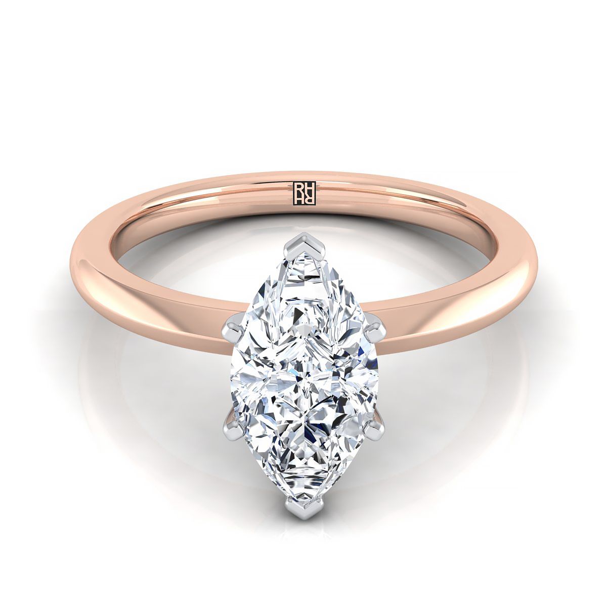 แถลงการณ์คลาสสิกของสไตล์ แหวนหมั้นมาร์คีสโซลิแทร์นี้มีการออกแบบที่ทันสมัยด้วยขอบมีดและการตั้งศูนย์ 6 ขาในทองคำกุหลาบ 14k