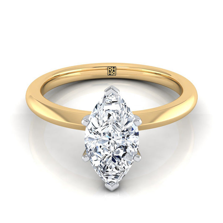 แหวนหมั้นมาควิสโซลิแทร์สุดคลาสสิกนี้แสดงถึงสไตล์ที่โดดเด่น พร้อมด้วยก้านแหวนแบบขอบมีดสมัยใหม่และการตั้งศูนย์กลางด้วยก้าน 6 ก้านในทองคำเหลือง 18 กะรัต