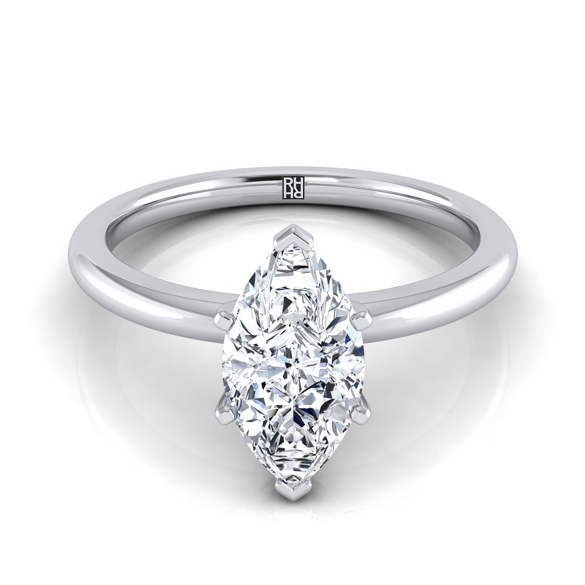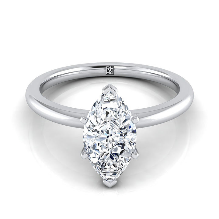 แหวนหมั้นมาควิสโซลิแทร์นี้เป็นการแสดงออกถึงสไตล์คลาสสิก โชว์แหวนวงโค้งมนและการตั้งศูนย์แบบ 6 ก้านในทองคำขาว 18 กะรัต