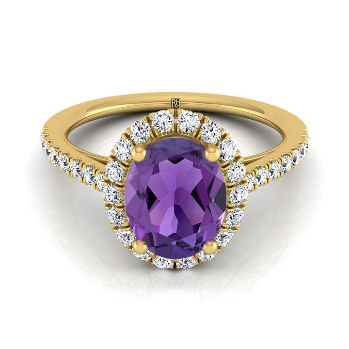 แหวนหมั้นทองคำเหลือง 14K รูปไข่อเมทิสต์ขนาดเล็กพร้อมฮาโลแฟชั่นฝรั่งเศสประดับเพชรปาเว่ - 3/8ctw