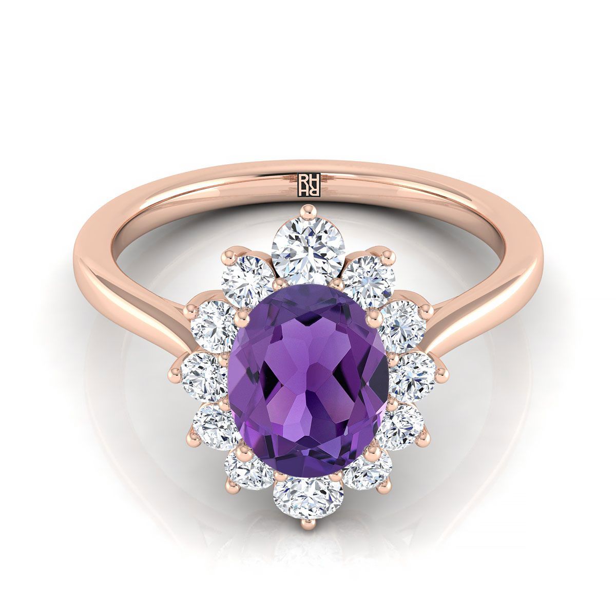 แหวนหมั้นโทนสีทองกุหลาบ 14K รูปวงรี ประดับอเมทิสต์ ลายดอกไม้ พร้อมฮาโลเพชร - 1/2ctw