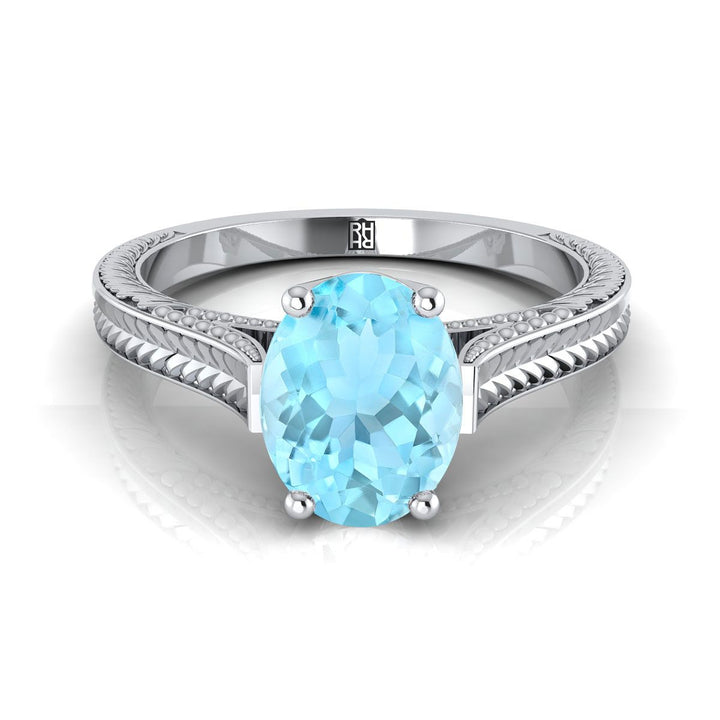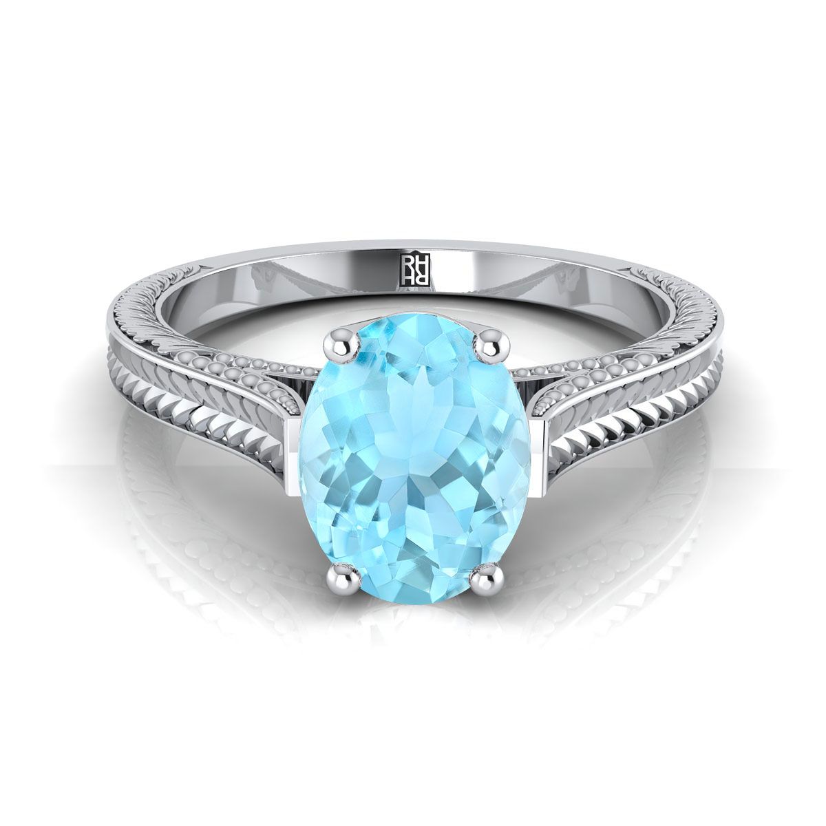 แหวนหมั้นเดี่ยวสไตล์วิหารวินเทจแกะสลักด้วยมือรูปไข่อะความารีนแพลทินัม