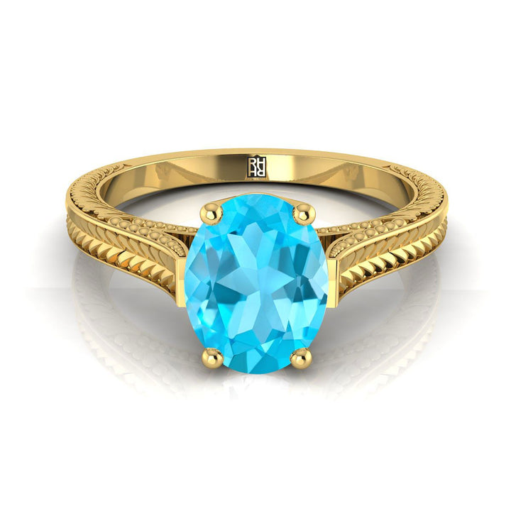 แหวนหมั้นทองคำเหลือง 18k พร้อมพลอยท็อปาซสีน้ำเงินรูปไข่ขนาด 8 x 6 มม. ตรงกลาง และการตกแต่งแบบมิลเกรนและดีไซน์สไตล์โบราณ