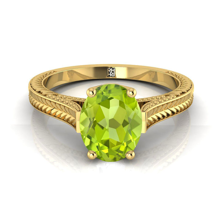 แหวนหมั้นเดี่ยวสไตล์วิกตอเรียนโบสถ์แกะสลักด้วยมือรูปไข่เพอริดอตทองคำเหลือง 18K