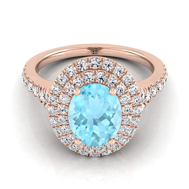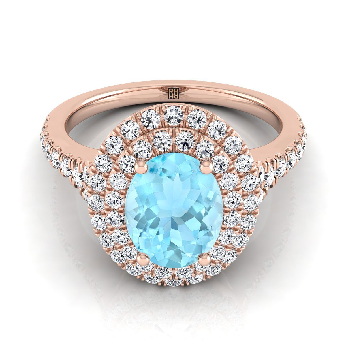 แหวนหมั้นเพชรแบบดับเบิลฮาโลรูปวงรีอะความารีน 14K โรสโกลด์ พร้อมเพชรปาเว่ขอบหยัก - 1/2ctw