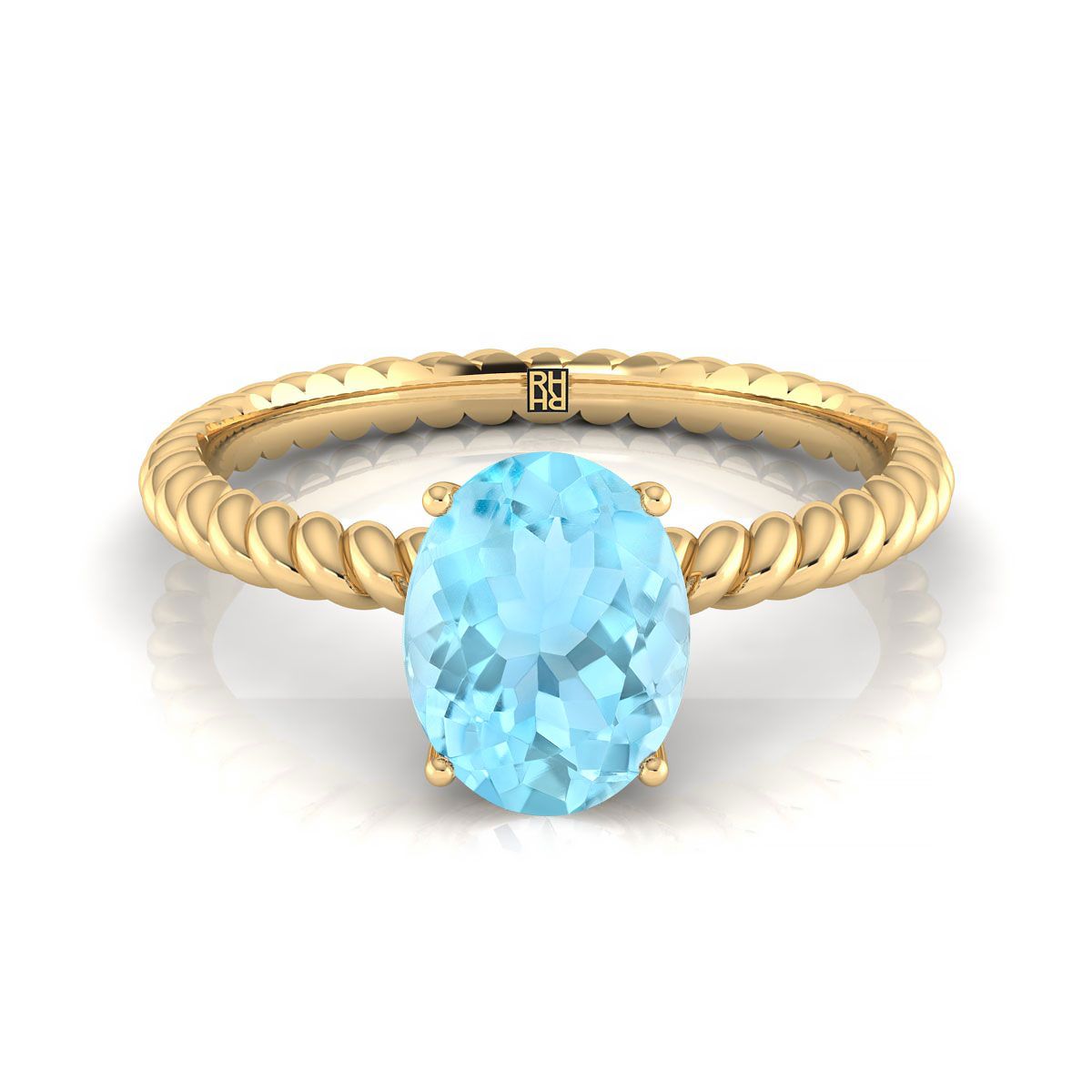 แหวนหมั้นกลางทองคำ 14 กะรัต สีเหลือง พร้อมพลอยอะความารีนรูปไข่ขนาด 8 x 6 มม. และดีไซน์เชือกที่วงแหวน