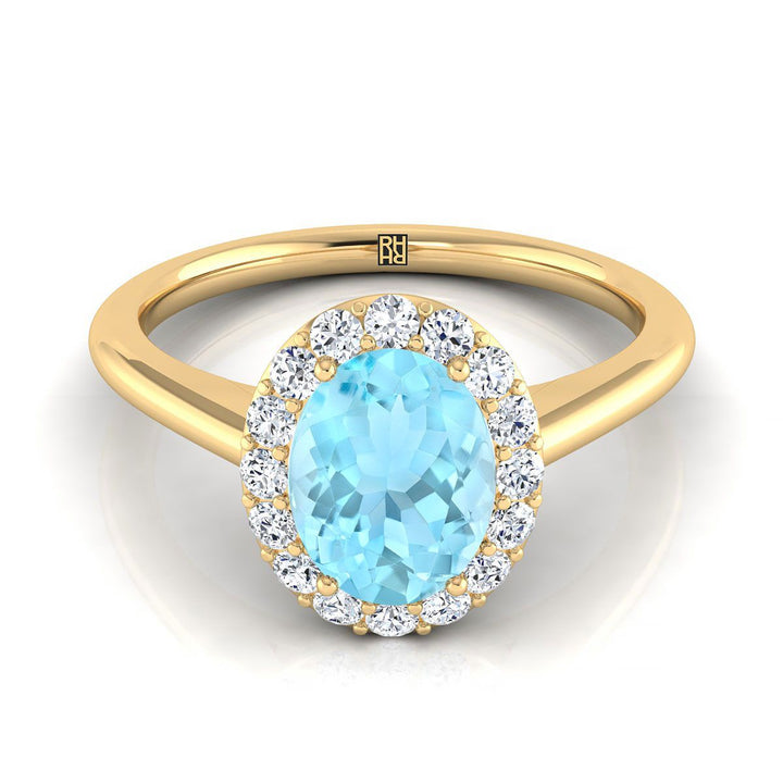 แหวนหมั้นทองคำเหลือง 14k พร้อมอัญมณีหลักรูปไข่ขนาด 8 x 6 มม. สีอะความารีน และเพชรทรงกลมเจียระไนแบบบริลเลียนต์ 16 เม็ด น้ำหนักรวม 0.20 กะรัต