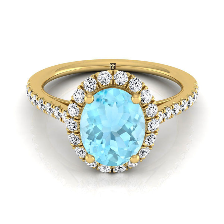 แหวนหมั้นเพชรฝรั่งเศสแบบปาเว่รูปวงรีอะความารีนขนาดเล็ก 14K ทองเหลือง