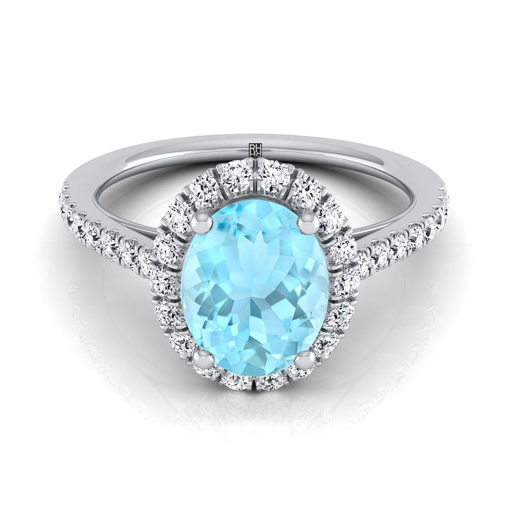 แหวนหมั้นเพชรฝรั่งเศสแบบปาเว่ทรงวงรีอะความารีนขนาดเล็ก 18K ทองคำขาว - 3/8ctw