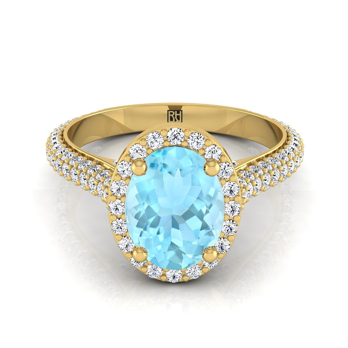 แหวนหมั้นทองคำเหลือง 14K รูปไข่อะความารีนไมโครปาเว่ ฮาโลว์ พร้อมเพชรข้างแบบปาเว่ - 7/8ctw